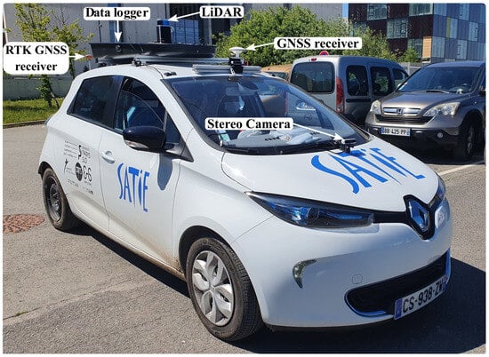 In order to further investigate the modalities complementarity to avoid falling into the trap of modality one dominance, the instrumented car from the SATIE laboratory (shown in Figure 3) was used to collect data from three sequences containing loops (total distance, respectively, 2 km, 1.08 km and 0.75 km). The vehicle has a camera (Intel Realsense D455), a LiDAR (Velodyne VLP-16), and a GNSS receiver (Altus Positioning System) that uses Real-Time Kinematic (RTK) corrections to offer precision at the centimeter scale. While the LiDAR data were recorded at 10 Hz, the stereo frames were obtained at a rate of 30 Hz.