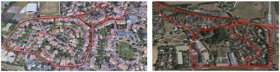 Data were recorded using ROS (Robot Operating System) and sensor calibration was conducted prior to data collection using MATLAB Version R2020b. To achieve sensor synchronization, for each LiDAR frame, the corresponding camera frame with the closest timestamp was selected. The data collection process involved driving the vehicle through urban and suburban environments under varying traffic and weather conditions to ensure diversity. The vehicle’s trajectories were chosen to include both dynamic (e.g., cars, buses, pedestrians) and static elements (e.g., buildings, houses, trees). Figure 4 illustrates a selection of the trajectories collected during the process. Additionally, several frames were largely dominated by the sky or the shade. All experimental validation and tests were conducted on a workstation with an Intel i7-11800H CPU (2.30 GHz) and 64 GB memory.