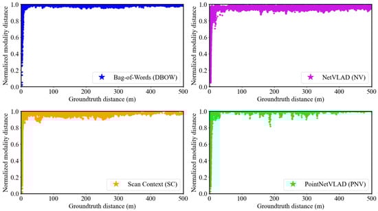 In this section, the proposed method is implemented by using four loop detection modalities: Bag-of-Words (DBOW) [], NetVLAD (NV) [], Scan Context (SC) [] and PointNetVLAD (PNV) []. First, we describe the datasets and experimental settings used to validate our approach. Then, we illustrate the correlation between the ground truth distance and modality distance between a current keyframe and a Loop Closure Candidate (LCC). Finally, we perform qualitative and quantitative extended evaluations of our approach.
