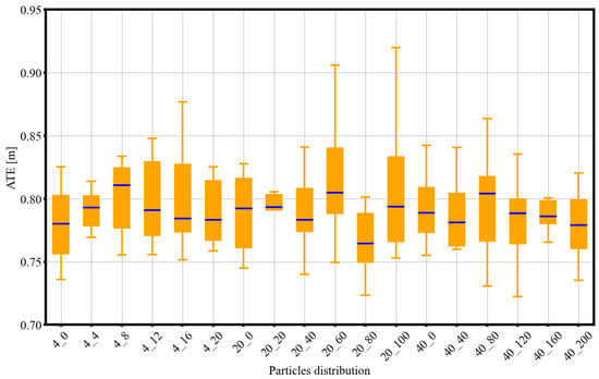 In Figure 6 we summarize the results of these trials. We find that the best configuration is the one given by . In this configuration, five particles are proposed by each of the four modalities used and 20 particles are added to the pool of all considered candidates based on the Gaussian model around the similarity-proposed candidates. This configuration achieves a mean ATE of 0.76 m (in contrast to the configuration, achieving a mean ATE of 0.78 m).