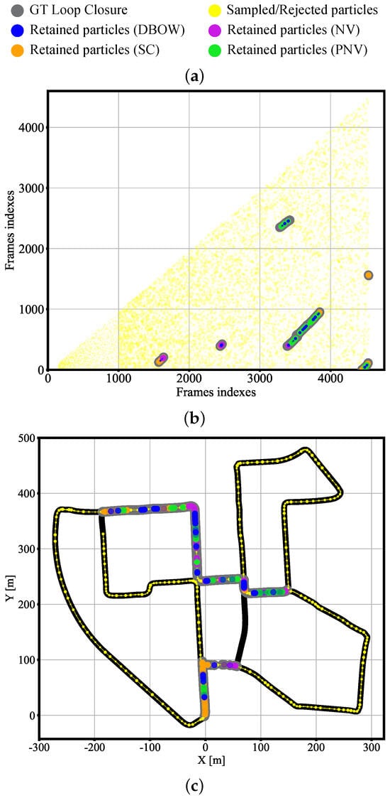 To validate the success of modalities modelization using the approach described in the previous subsection, we first show in Figure 8 how the sampled/rejected loop closure candidates are distributed over all previous frames of the current pose and how all modalities were able to contribute to detecting LC. This figure demonstrates how the proposed framework effectively generates probable LCCs across all traversed poses during the AGV’s trajectory while eliminating inaccurate candidates (depicted as yellow dots). Conversely, the retained particles with the highest weights are concentrated within the ground truth loop closure area. We recall that a ground truth LC is defined as a pair of poses with a relative distance of less than 3 m.