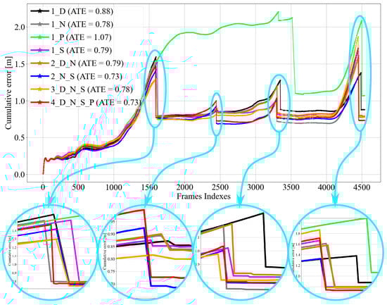 Indeed, incorporating four modalities (DBOW, SC, NV, PNV) significantly enhances the system’s ability to detect the LC at the earliest occurrence, facilitating timely trajectory corrections and more effective mitigation of cumulative drift. This results in a 40.90% cumulative error reduction in the last loop detected when using the four modalities compared to using a single one. Table 5 summarizes the most relevant cumulative error reduction under various configurations of the MMLC.
