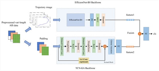 AIS data are inherently time series data, containing temporal information, such as vessel speed and positional changes over time, which is crucial for capturing the dynamic behaviors and movement patterns of vessels. Many researchers have conducted in-depth studies on AIS time series data using algorithms like recurrent neural networks (RNNs), yielding significant results. For example, Liu et al. [18] proposed a vessel trajectory prediction framework based on AIS data, with an LSTM network at its core. By integrating ship traffic conflict scenario modeling and the concept of social force, and by reconstructing a hybrid loss function, they improved the prediction accuracy. Zhao et al. [11] introduced the GAT-LSTM model, which combines graph attention networks and long short-term memory networks to extract spatial and temporal features from vessel trajectories, exhibiting strong robustness in trajectory prediction. Gao et al. [19] proposed a novel MP-LSTM method for vessel trajectory prediction, combining the advantages of TPNet and LSTM. This method designs an efficient AIS data preprocessing pipeline and introduces physical assumptions to balance the complexity and accuracy of the prediction model. Additionally, some researchers have applied convolutional neural networks (CNNs) to classify and analyze vessel trajectory images generated from AIS data. For instance, Chen et al. [12] proposed a CNN-based vessel movement pattern classification algorithm (CNN-SMMC), converting AIS trajectories into movement images for classification. Luo et al. [13] developed a method that integrates speed information into trajectory images and applied a ResNet-based model for vessel type classification. Their experiments, using real AIS data from five types of vessels, validated the classifier’s effectiveness. Duan et al. [20] proposed a semi-supervised deep learning method called SSL-VTC for vessel trajectory classification. This approach leverages a semi-supervised learning framework that not only relies on labeled data but also learns latent structures from unlabeled data, achieving superior performance in vessel trajectory classification tasks. Yang et al. [21] introduced a vessel-type recognition method based on trajectory images generated from vessel speed and acceleration. Using CNNs, they extracted features from the trajectories under three different navigation states, achieving efficient vessel-type recognition. Bai et al. [22] showed that in sequence modeling tasks, simple convolutional architectures outperform classic recurrent neural networks across a variety of tasks and datasets, exhibiting greater long-range memory capabilities. However, while these deep learning models have achieved promising results in analyzing AIS data, they often exhibit a strong dependence on single-modal data. In practical applications, vessel trajectory images and AIS time series data each contain rich spatial and temporal feature information. If these modalities are processed in a fused manner, it could potentially lead to better performance in vessel-type recognition tasks.