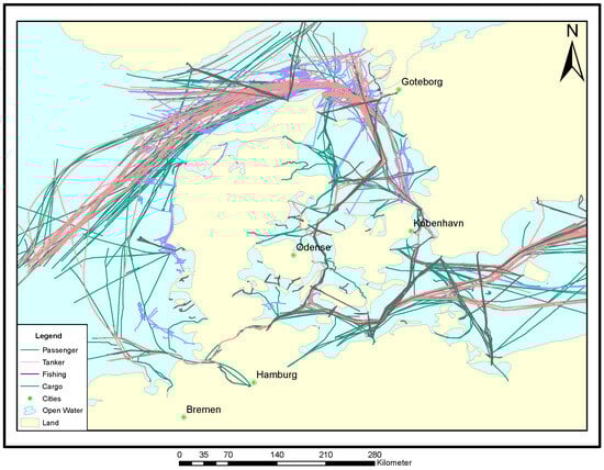The raw AIS data for the self-constructed AIS dataset in this study were sourced from the official website of the Danish Maritime Authority [6]. The study utilized historical AIS data spanning a 7-day period in April 2024 along the Danish coastline. Each file contains approximately 1.5 GB of daily records. To facilitate understanding of the AIS data, we visualized unified tracks for four vessel types using latitude and longitude information from selected data points. Figure 3 illustrates the distribution range of the data.