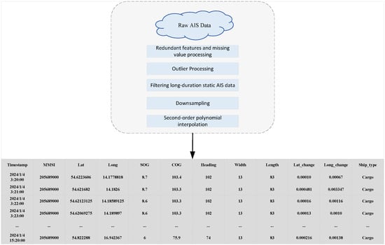 The raw AIS data exhibits issues such as feature redundancy, inconsistent time intervals, and missing data, necessitating data preprocessing operations. The data preprocessing workflow is illustrated in Figure 5.