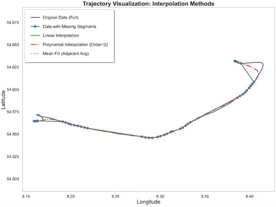 To address the issue of missing data, this study employed the second-order polynomial interpolation method. This approach leverages the trend information of adjacent points in time series data to construct a second-order polynomial function for filling in missing values. Compared to commonly used methods such as linear interpolation and mean imputation, second-order polynomial interpolation more accurately captures the smooth variations in trajectories while avoiding the oscillation issues that may arise with higher-order polynomial interpolation. Figure 6 illustrates a simulation experiment conducted on a segment of AIS trajectory data using different interpolation methods. The experiment first randomly generated segments of continuous missing trajectory points, followed by applying various interpolation methods to complete the data. The results demonstrate that second-order polynomial interpolation exhibits superior performance in restoring the overall trajectory trend.