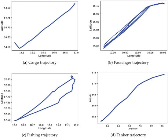 The preprocessed AIS data contain the latitude and longitude position information for each vessel at different time points. This positional data can be used to generate trajectory images for each vessel over a specific period. During the training process, these trajectory images will be fed into the network simultaneously. Figure 7 illustrates examples of trajectory images for various types of vessels.