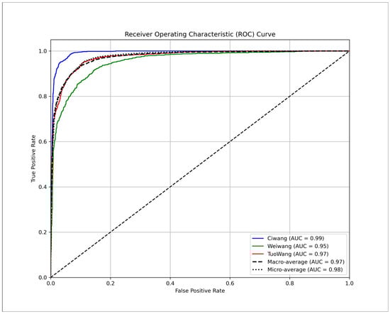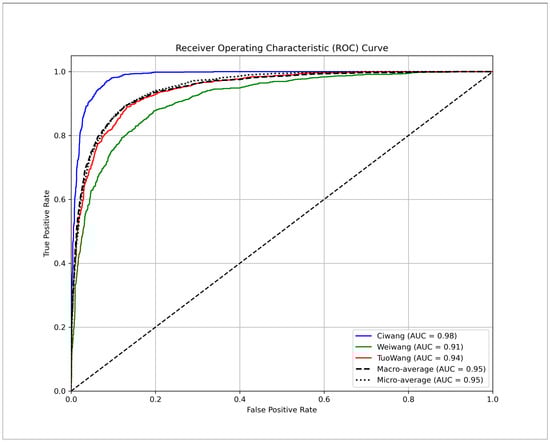 Figure 9 and Figure 10 present the ROC curves of our algorithm across different network models on a public dataset containing three types of fishing activities. The X axis represents the false positive rate, while the Y axis represents the true positive rate. The dotted line indicates the micro-average ROC curve, and the dashed line shows the macro-average ROC curve. The solid blue line represents the ROC curve for gillnetting, the solid green line represents the ROC curve for purse seining, and the solid red line represents the ROC curve for trawling.