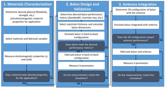 The methodology used for this research is outlined in Figure 2 and can be described in the following three steps: (1) materials characterization, (2) balun design and validation, and (3) antenna integration. First, the material properties for the application, in terms of both the physical and electromagnetic characteristics, were defined. Various applications could require different materials based on the strength, flexibility, configuration, or frequency. Then, the materials were collected, and the electromagnetic properties of the materials were measured. If the material satisfied the desired properties, the substrate could be used for the balun design and validation.