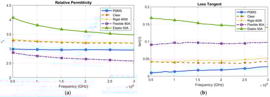 Materials characterization was performed using the Keysight N1501A high-temperature dielectric probe kit []. The resins were printed and the PDMS was fabricated into cubes of the correct size based on the dielectric probe requirements. The characterization of the materials in terms of the relative permittivity and loss tangent is displayed in Figure 3. As seen, all of the materials had a relative permittivity (εr) between 2 and 4, as shown in Figure 3a. The Flexible and Elastic printer resins had a high loss tangent (tanδ) near or above 0.1, as shown in Figure 3b. The solid resins (i.e., Clear and Rigid) had a lower loss tangent than the flexible resins. PDMS also had a low loss tangent, as expected from previous work []. The material measurements will be verified via simulation and measurement in Section 5.