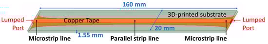 The baluns were simulated in a back-to-back configuration in Ansys 2022 R1 High Frequency Simulation Software (HFSS) []. The simulation setup is displayed in Figure 4. The substrate is 160 mm × 20 mm × 1.55 mm in size. The microstrip lines are at both ends of the substrate while the parallel strip line is in the middle. The balun is fed by lumped ports at both ends to simulate the SMA connectors. The measured properties from Section 4 were imported as material properties for the 3D-printed substrate. The simulated results are displayed in Figure 5.