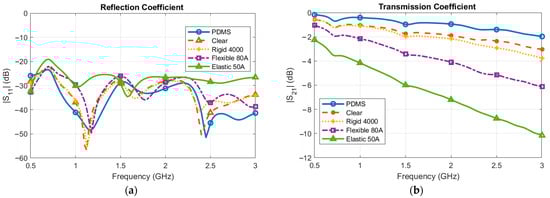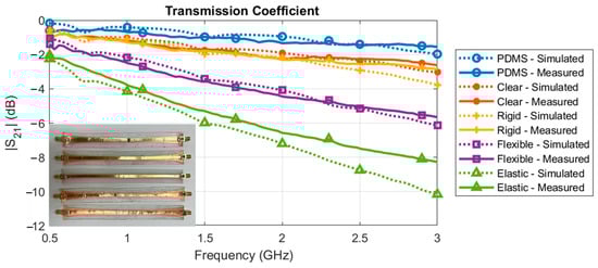 In terms of the simulated reflection coefficient, |S11|, all of the baluns performed exceptionally well. The |S11| was below −20 dB across the bandwidth for all of the substrates, except for Elastic 50A. For Elastic 50A, the |S11| was below −20 dB, except for the 650–750 MHz range. This minimal reflection coefficient indicated the baluns are well matched and the power was effectively delivered to the device. There was more variation in the simulated transmission coefficient, |S21|, of the baluns. In this case, the transmission coefficient can also be considered the insertion loss of the balun. Substrates with a higher measured loss tangent (e.g., Elastic 50A and Flexible 80A) inserted more loss into the system than substrates with a lower loss tangent (e.g., Clear and PDMS).