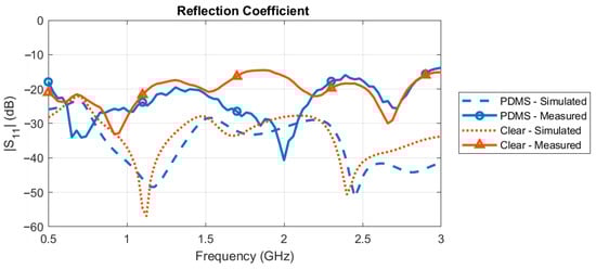 Simulated vs. measured reflection coefficient of the fabricated antenna with the PDMS and Clear baluns.