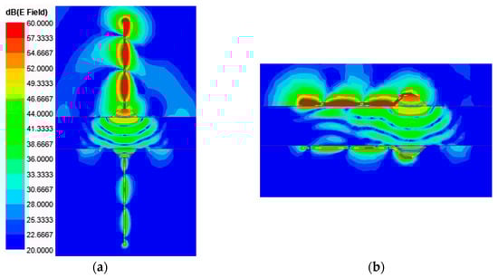 There were the following two potential orientations for the balun to feed the HCLA: perpendicular and conformal (Figure 1). The balun integrated with the HCLA was simulated in both orientations in Ansys HFSS. First, we analyzed the simulated electric fields of the two Clear balun configurations to gain insight into the different orientations. In Figure 9, the magnitude of the electric field at 3 GHz is displayed for both the perpendicular (Figure 9a) and conformal (Figure 9b) configurations. It can be seen in Figure 9 that there was some coupling that occurred between the conformal balun and the tissue prior to the antenna. However, the field patterns and the magnitude of the fields were nearly identical in the tissue region directly between the antennas.