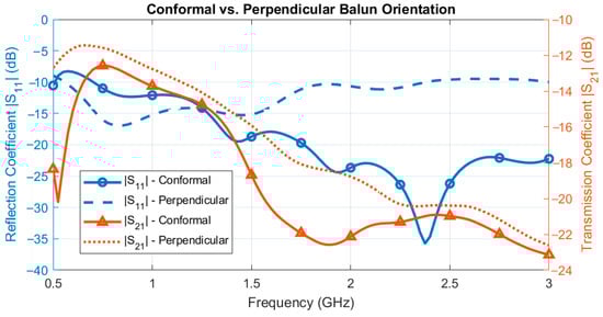 The simulated S-parameter results for the Clear balun integrated with the antenna are displayed in Figure 10. In terms of the reflection coefficient, |S11|, the conformal balun significantly outperformed the perpendicular balun across the bandwidth. In the perpendicular orientation, the width of the feed gap was the same as the width of the balun substrate (i.e., 1.55 mm). This feed gap between the two balanced arms of the antenna was too large in the perpendicular orientation and significantly degraded performance of the antenna; however, thinner substrates would have been more difficult to fabricate and implement. In terms of the transmission coefficient, |S21|, the conformal balun and the perpendicular balun had comparable performance. The conformal balun had slightly lower transmission loss because of its orientation, where the balun was placed near the tissue. There was some coupling between the balun and tissue that did not occur in free space (i.e., the perpendicular orientation), as shown in Figure 9a. However, the benefits of the conformal orientation in terms of the reflection coefficient performance and wearability far outweighed the slight reduction in the transmission coefficient. That is, there was a compromise to be made between wearability and performance.