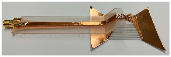 After fabricating the individual substrates, the conductors were cut from copper tape using an automated cutting machine. The copper tape was placed on the substrates, and the SMA launchers were soldered to the copper tape, as seen in Figure 6. Copper tape was used for the conductors because it is easy to fabricate for prototypes, highly conductive, and flexible. Copper tape has also demonstrated comparable electromagnetic performance to screen printing or etched aluminum []. Though conductive inks could also be used as an alternative, they are prone to cracking when placed on flexible substrates (i.e., PDMS, Flexible 80A, or Elastic 50A). The final fabricated baluns can be seen in the inset of Figure 7.