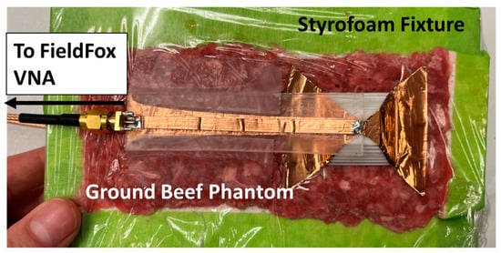 The experimental setup is displayed in Figure 12. Two fabricated antennas integrated with the conformal baluns were placed on either side of ground beef phantom and connected to the FieldFox network analyzer via an SMA launcher. The phantom was contained in a Styrofoam fixture with a fixed thickness of 30 mm. Plastic wrap was used to protect the equipment and was not expected to impact the measurement. The properties of ground beef, however, may have varied due to changes in the temperature, fat content, and/or freshness. In this work, the impact of the balun on the S-parameters of the HCLA will be evaluated. Additional HCLA parameters such as radiation patterns and the specific absorption rate (SAR) can be found in [].