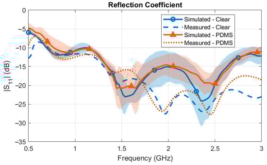 The simulated versus measured reflection coefficient of the HCLA with the balun is displayed in Figure 13, where the shaded region represents the standard deviation between six total measurements. The average measured results matched well to the simulated results, especially in terms of the low-frequency cutoff (i.e., |S11| < −10 dB). The measured low-frequency cutoff for the Clear balun was 680 MHz while the simulated cutoff was 610 MHz. The measured low-frequency cutoff for the PDMS balun was 730 MHz while the simulated cutoff was 650 MHz. Across the bandwidth, the reflection coefficient remained below the target value of −10 dB for both the Clear and PDMS baluns. This ensured that the majority of the power was transmitted through the antenna and into the tissue. The mean standard deviation across the frequencies was 3.39 dB and 2.37 dB for the Clear and PDMS baluns, respectively. Variations between the measurements and differences from the simulation were due to fabrication errors, such as the tolerances of the equipment, the surface roughness of the copper tape, the airgap thickness between the balun, antenna, and phantom, and/or differences in the electromagnetic properties of the ground beef phantom.