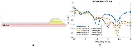 The (a) simulation setup of the HCLA with different airgap heights between the balun substrate, antenna dielectric, and ground beef phantom and (b) the simulated vs. measured reflection coefficient results.