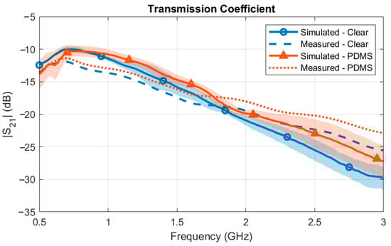 The transmission loss between the two HCLAs was simulated and measured through 30 mm of tissue phantom. The simulated versus measured transmission coefficient is illustrated in Figure 15, where the shaded region represents the standard deviation between the three total measurements. For both the Clear and the PDMS baluns, the measurements matched the simulations well. The mean standard deviation across the frequencies was 1.45 dB and 1.57 dB for the Clear and PDMS baluns, respectively. The difference between the measurements and the variation between the measurement and simulation could be attributed to fabrication errors, misalignment, and/or variations in the properties of the ground beef phantom. Care was taken to ensure that the antennas were aligned; however, small misalignments may have contributed to errors, especially at higher frequencies, where the wavelength is shorter. Variations in the phantom could have also contributed to a higher transmission loss between the antennas. The minimum transmission loss was −10.46 dB at 792 MHz for the PDMS balun, and −9.45 dB at 747 MHz for the Clear balun. As expected, the loss increased with the frequency due to the smaller penetration depth of the electromagnetic waves into the biological tissues.