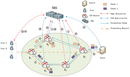 In this paper, we propose a multipath-based caching architecture based on the multipath transmission mechanism supported by the NRS. As shown in Figure 1, the user obtains the desired content by sending a request message to the network. The source represents the entity storing the data, which provides data to satisfy the user’s content retrieval needs. In this paper, Named Data Chunks (NDCs) are the fundamental units of in-network caching. These chunks are generated by dividing the original application layer content objects into fixed-size segments. Each NDC has a globally unique name. In addition to forwarding functions, the ICN routers also have the capability to support multipath transmission, cache chunks, and respond to user requests. The NRS is responsible for storing the mapping between EIDs and IP addresses. The details of the multipath transmission, caching, and retrieval processes are as follows: