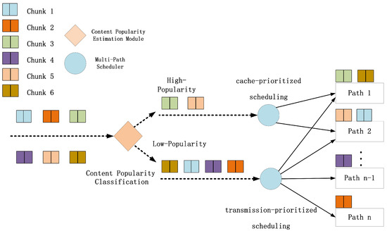 To make full use of the limited in-network caching and bandwidth resources, we propose a content-aware hybrid multipath selection strategy based on the principle of prioritizing high-popularity content for caching and low-popularity content for transmission. This strategy consists of a content popularity estimation algorithm, a cache-prioritized scheduling strategy, and a transmission-prioritized scheduling strategy. As illustrated in Figure 2, we first analyze the popularity of content to classify it into high-popularity or low-popularity categories. High-popularity content is scheduled with a cache-prioritized strategy to maximize cache resource utilization, while low-popularity content is scheduled with a transmission-prioritized strategy to avoid congestion and reduce transmission latency.