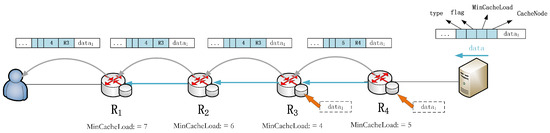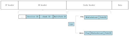 Figure 3 illustrates the design of the packet header. To ensure compatibility with the existing IP network architecture, the ID message header is placed in the payload of the IP packet, while the cache message header resides in the payload of the ID packet. The ID message header contains key information such as the ReceiverID, which identifies the receiving node; the ChunkID, which specifies the unique identifier for the chunk being transmitted; and the MultiPathID, which identifies the transmission path. The cache message header indicates whether the packet is a request or data message and includes fields essential for implementing the cache load-based selection strategy. The Type field specifies whether the packet is a request (req) or data (data) packet. The MinCacheLoad field records the minimum cache load along the transmission path, applicable for both request and data packets. The NodeID field identifies the selected cache node for storing the chunk. The Flag field determines the caching strategy, where a value of 0 indicates the default caching strategy (i.e., the content is cached whenever there is available space in the cache node, aiming to quickly fill the in-network cache), and a value of 1 indicates the cache load-based strategy. By default, the flag for high-popularity content is set to 1, while the flag for low-popularity content is set to 0.