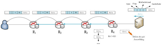 As mentioned in Section 3.1, large-scale content is uniformly divided into equal-sized chunks, typically measured in megabytes (MB), for transmission. Due to the Maximum Transmission Unit (MTU) limitations of underlying network infrastructure, the size of a single data packet cannot exceed the MTU, which is typically set to 1500 bytes. To comply with this limitation, the transmission of chunks requires splitting them into multiple packets. In ICN networks, receiver-driven transport control protocols are widely used. These protocols, initiated by the receiver, allow for dynamic adjustment of transmission rates, making them well-suited for content distribution, cache management, and bandwidth allocation. In our implementation, the first packet of each chunk is responsible for identifying the node with the minimum cache load along the transmission path. The ID of this node is recorded for subsequent operations. The detailed process of cache decision for a given chunk is as follows:
