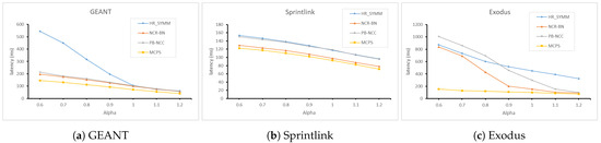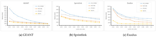 Figure 13 illustrates the variation in cache hit ratio for different caching strategies as the Zipf distribution parameter changes. The cache size ratio is set to 0.05, and the request rate is 50 requests per second. MCPS provides approximately 20.3%, 16.2%, and 10.4% improvement in cache hit ratio over NCR-BN in the three topologies, respectively. As the value of increases, the cache hit ratio gradually improves for all strategies. This trend is due to the increasing concentration of requests on a small subset of popular content as grows.