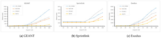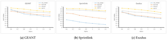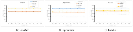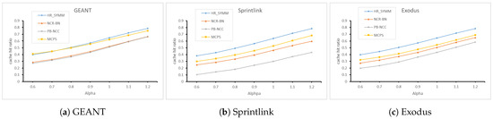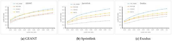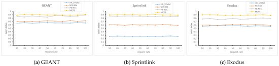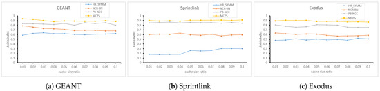 Figure 17 illustrates the variation in cache node load balancing across different topologies as the request rate increases. The cache size ratio is uniformly set to 0.05, and the Zipf distribution parameter is 0.8. The MCPS strategy consistently maintains an advantage in cache node load balancing. Specifically, MCPS provides approximately 5.3%, 4.9%, and 14.1% improvement in cache node load balancing over PB-NCC across the three topologies, respectively.