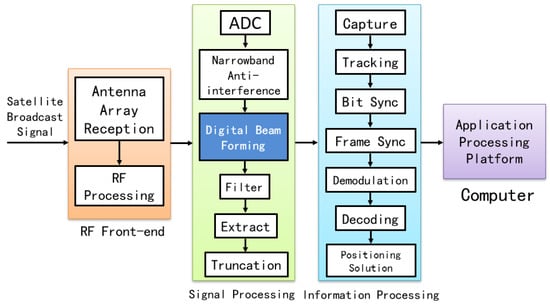 A typical processing flow for a LEO satellite broadcast signal reception terminal is shown in Figure 1 [4]. The terminal processes the signal through radio frequency (RF) processing, analog-to-digital conversion (ADC), narrowband interference suppression, digital beamforming, filtering, extraction, and truncation, followed by information processing such as signal capture, tracking, timing synchronization, frame synchronization, data demodulation, message decoding, and positioning operations. This enables signal reception and processing in complex electromagnetic interference environments.