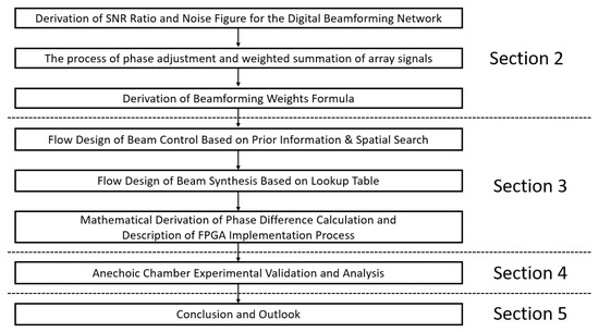 The second part of the paper provides the derivation of digital beamforming weights, the third part focuses on the design of digital beam control and beam synthesis algorithms, the fourth part presents anechoic chamber experimental validation and analysis, and the fifth part offers a summary and outlook of the entire paper. The organizational structure of the entire paper is shown in Figure 2.