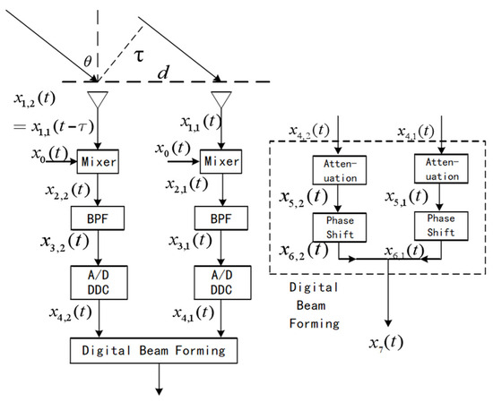 Figure 5 illustrates the signal processing flow of a digital array radar with two signal paths [17,20], using a two-element linear array as an example [21,22,23].