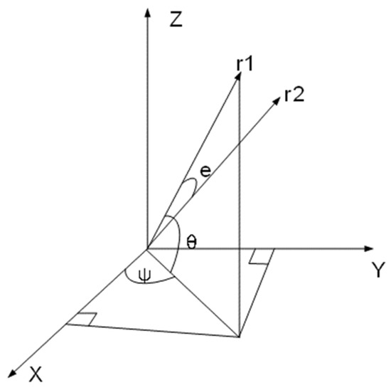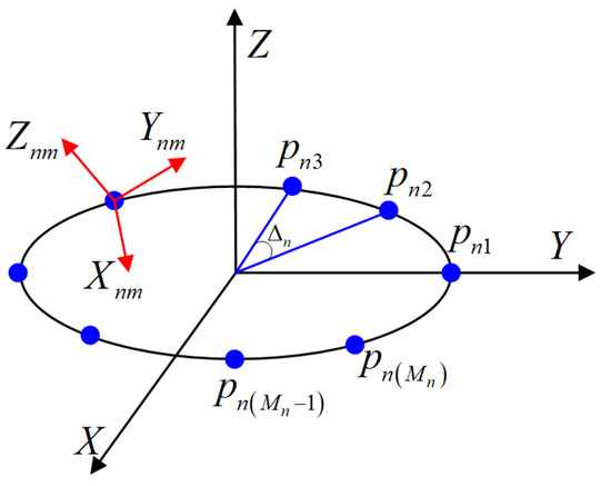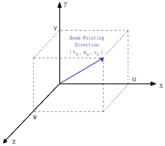 In the three-dimensional coordinate system, let represent the coordinates of the -th antenna element, where , , and correspond to the three directions in three-dimensional space. The beam pointing direction is denoted as , as shown in Figure 7 [18,24,25].