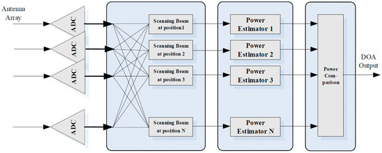 From Equation (20), it can be seen that by detecting and making decisions on the DFT output and using the correspondence between the DFT output channels and the angles given by this equation, the results of interference detection or direction-of-arrival (DOA) can be obtained. Subsequently, the beamforming weights can be determined based on the above results [26,27].