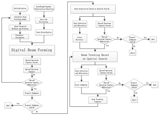 Before signal summation in DBF, the phase of the data from each channel needs to be adjusted to ensure that the phase errors are within an acceptable range. This allows for the summation of the channel data, thereby improving the received signal power and SNR. The software flow structure of DBF is divided into two steps: beam control and beamforming synthesis. The function of beam control is to align the main beam of the antenna array with the direction of the useful signal, so that the subsequent beamforming synthesis can maximize the gain of the combined useful signal. The purpose of beamforming synthesis is to combine the useful signals. In this scheme, the control method is a combination of prior information and spatial domain search, where logical control determines the beam direction. Then, the phase difference between the signals to be summed is extracted, and after compensating for the phase difference, the beamforming is completed.