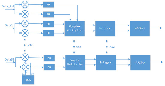 In the above process illustrated in Figure 1, digital beamforming (DBF) uses digital phase shifting to compensate for signal delays caused by the physical characteristics of signal transmission in each channel, including delays caused by direction-of-arrival (DOA) or angle-of-arrival (AOA). This ensures phase alignment for incoming signals from a specific direction, achieving coherent superposition and maximizing energy reception in the desired direction [5]. By adjusting beamforming weights, the beam can be steered in different directions to achieve beam scanning. Through parallel multi-channel processing, multiple beams can be formed simultaneously in various directions [6].