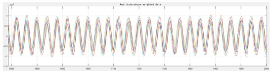 For the beamforming network of two signals shown in Figure 5, the key to beamforming lies in determining the phase shift values and in Equation (11). In practical engineering applications, the problem of determining the phase shift values is transformed into the problem of determining the beamforming weights for each signal. Therefore, in the two-signal beamforming network, the determination of the phase shifts and can be simplified to the determination of the beamforming weights and . The process of phase correction for a single channel to achieve DBF inside the FPGA is shown in Figure 6. The entire DBF module operates at a rate of 200 M, with the NCO using a 32-bit control word and a 6-bit bit width, essentially functioning as a complex multiplier. All operations are performed on the JFM7K325T chip produced by Fudan Microelectronics (Shanghai, China), which contains a large number of DSP units to handle multi-beam digital down-conversion and phase-shifting processing. The implementation method is that the signal is first multiplied by the local NCO to obtain the I/Q signals. Then, the I/Q data is multiplied by the beamforming weights and using complex multiplication to obtain the I/Q signals. After the 32 signals are summed, filtering is applied to obtain the final synthesized beam, completing the beamforming function.