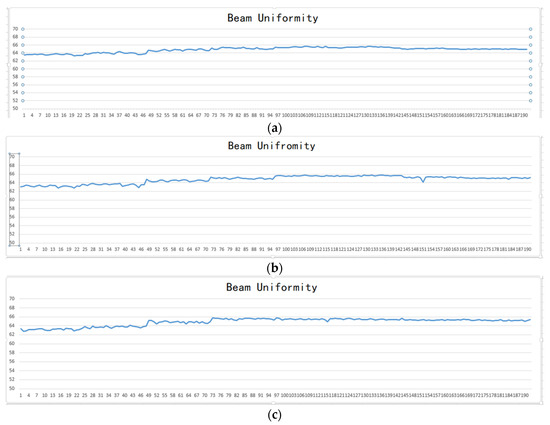 Beam uniformity test results for the three frequency points. (a) Beam uniformity test results for the right-hand circularly polarized signal at the operating frequency f = 2294.75 MHz. (b) Beam uniformity test results for the right-hand circularly polarized signal at the operating frequency f = 2242.8 MHz. (c) Beam uniformity test results for the left-hand circularly polarized signal at the operating frequency f = 2242 MHz.