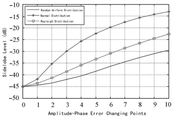 In general, amplitude and phase errors follow certain distributions. For example, amplitude errors between channels often follow a normal distribution, while phase errors follow a random uniform distribution. To further investigate the effects of amplitude and phase errors on beam pointing and sidelobe levels, it was assumed here that amplitude and phase errors follow Rayleigh distribution, normal distribution, and uniform random distribution, respectively. The variations in the beam radiation pattern when errors exist in different channels were analyzed.