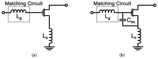 Figure 1 shows the schematics of conventional CS topologies for achieving simultaneous noise and input matching. In Figure 1a, the CS topology incorporates and an input matching network with a series inductor () at the gate node. The condition for satisfying SNIM () can be achieved by adjusting the values of and .