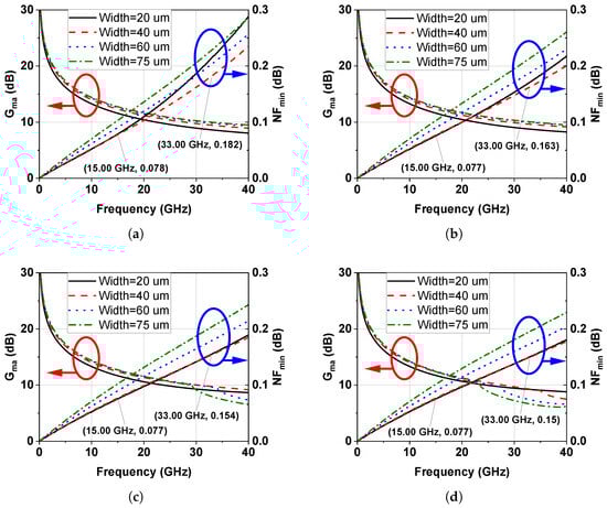 Figure 2 shows the simulated maximum available gain () and minimum noise figure () for varying transistor widths with different numbers of fingers (NoF). While tends to increase as the transistor width increases, the change is relatively small. Moreover, the change in with respect to the number of fingers is negligible. In the design, more focus was placed on optimizing the overall noise performance of the circuit. As a result, the width and number of fingers (NoF) of the first-stage transistor were selected to achieve the lowest possible minimum noise figure () within the target bandwidth. As shown in Figure 2d, a width of 40 μm and NoF of 6 are selected since they provide the lowest within the target bandwidth of 15–33 GHz.