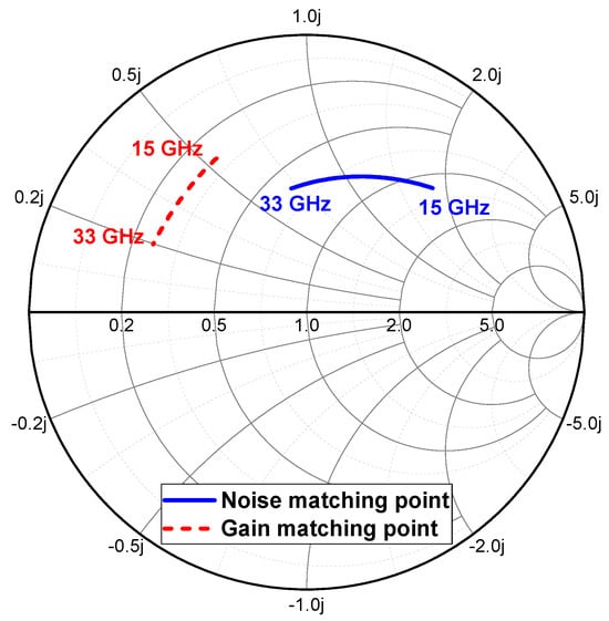 Much previous work on GaAs-based low-noise amplifiers (LNAs) has been reported, covering a wide range of frequency bands, including 1–12.5 GHz [5], 10–20 GHz [6], 24.25–33 GHz [7], and 40–51 GHz [8]. These studies primarily focus on broadband designs to meet the demands of various applications. The primary objective of LNA design is to achieve maximum gain while minimizing the noise figure (NF) within the target frequency band. However, previous work exhibits a major limitation in that simultaneous noise and input matching (SNIM) is restricted to a narrow range relative to the target frequency band [5,9,10].