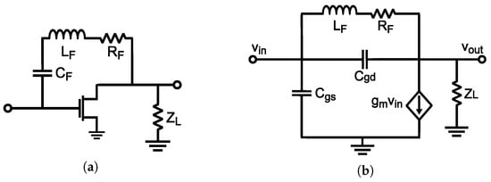 Figure 4 shows the schematic of the gain core with the proposed shunt R-L-C feedback network and its equivalent small-signal model. The proposed shunt R-L-C feedback consists of a resistor (), an inductor (), and a capacitor (); is used for DC blocking purposes. It is assumed to be a sufficiently large value and is ignored in the analysis in Figure 4b. In Figure 4b, and are the parasitic capacitances of the transistor.