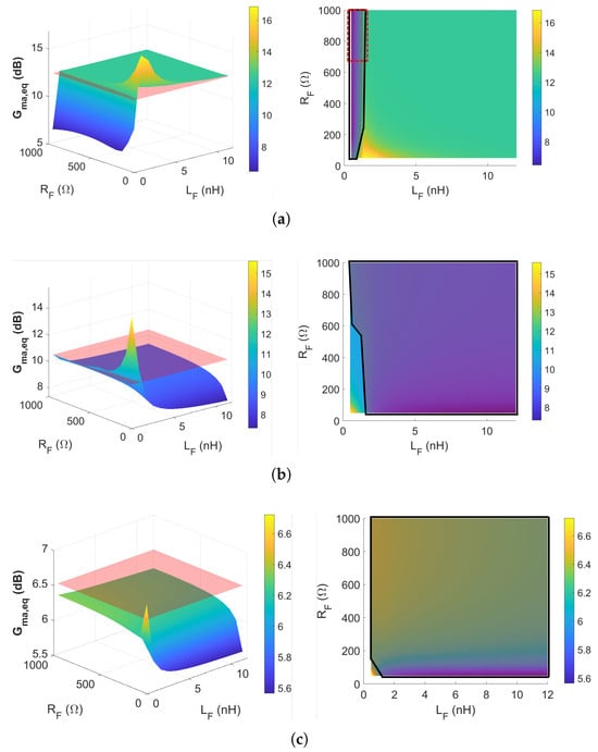 Figure 6 shows the calculated in (11) for variations in and at 15 GHz, 24 GHz, and 33 GHz. The simulated inductor range (0.2–12 nH) was determined based on verified inductor values available in the PDK used for the design. For the simulated resistor range, a value between 0 and 1000 Ω was chosen to ensure practical implementation and to avoid excessively large resistor values that could negatively affect the design. This approach ensures that the analysis remains grounded in realistic component values, reflecting the constraints and capabilities of the design process. To enhance circuit stability and extend bandwidth, the feedback network configuration is selected to operate within the negative feedback region. The plane parallel to the and -axis (shown in red) in the graph represents the intrinsic gain of the transistor () without the feedback network. The area below this plane indicates that the feedback network operates with negative feedback, while the area above it indicates positive feedback. The area that operates with negative feedback at each frequency is highlighted with a black solid line for clearer visualization on the right side of Figure 6. The values of and are selected within this range. At 15 GHz, compared to 24 and 32 GHz, most of the region operates with positive feedback, whereas only a small portion within the target band exhibits negative feedback. To operate in the negative feedback mode within the target frequency band, the range of and values is approximately = 650 Ω to 1000 Ω and = 0.12 nH to 1.4 nH, as indicated by the dashed lines on the right side of Figure 6a. As shown in Figure 6a, the variation in is relatively minor with changes in the value, while changes in the value significantly impact within the negative feedback range. To prevent from dropping excessively in this range, is set to 1.2 nH. The choice of the optimum value of will be explained in the next paragraph.