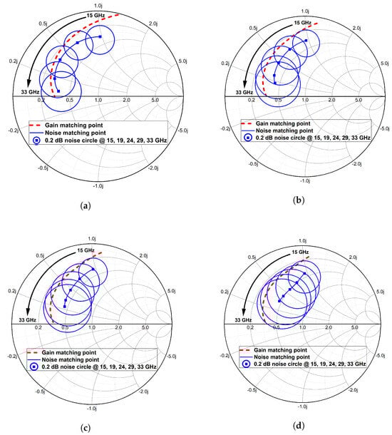 Variations in the noise matching points with 0.2 dB noise circles and the gain matching points of the gain core with an R-L-C feedback network according to various values: (a) = 100 Ω, (b) = 250 Ω, (c) = 400 Ω, and (d) = 1000 Ω.