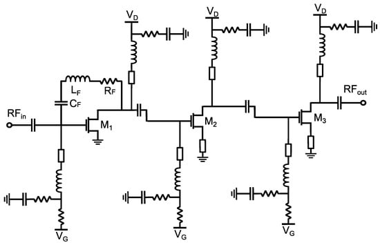 To demonstrate the feasibility of the proposed R-L-C shunt feedback network, a three-stage low-noise amplifier is designed using a 150 nm GaAs pHEMT process. Figure 8 shows the schematic of the proposed three-stage LNA. The proposed gain core with the R-L-C shunt feedback network is adopted as the first stage with a transistor dimension of 6 × 40 μm to achieve SNIM. The subsequent second and third stages adopt transistor dimensions of 6 × 50 μm and 6 × 60 μm, respectively, to enhance linearity.
