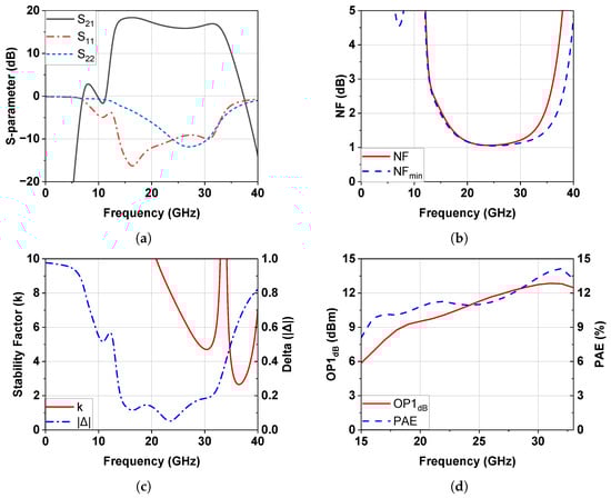 Figure 10 shows the simulated S-parameters versus frequency, noise figure versus frequency, k and versus frequency, and and PAE versus frequency of the proposed LNA. As shown in Figure 10a, the simulation results show a 3-dB bandwidth of 20 GHz (13–33 GHz), power gains () of 17.1 ± 1.5 dB, and relatively wideband input matching. In Figure 10b, the NF also shows a flat response within the targeted frequency range and remains below 2.1 dB. Considering the results of input matching and NF, the concept of the proposed wideband SNIM-based gain core with shunt R-L-C feedback is successfully demonstrated. In Figure 10c, the unconditional stability ( and ) of the amplifier is verified by simulation at all frequencies (DC to ) at the input and output terminals. The simulated peak output () and power-added efficiency (PAE) at input are 12.8 dBm and 14.2 %, respectively.