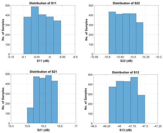 Simulated S-parameter results from a Monte Carlo analysis with 2000 samples at the center frequency of 24 GHz to evaluate the impact of process, voltage, and temperature (PVT) variations.
