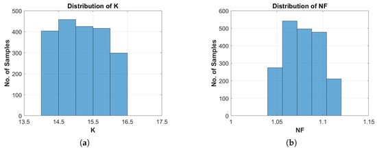 Figure 11 and Figure 12 show the simulated S-parameters, (a) Rollett’s stability factor, and (b) noise figure from a Monte Carlo analysis using 2000 samples at a center frequency of 24 GHz to evaluate the impact of process, voltage, and temperature (PVT) variations. The histograms represent , , , , Rollett’s stability factor, and NF, respectively. As shown in Figure 11, the variations in the S-parameters are less than 1 dB. In Figure 12, the variations in the noise figure (NF) are less than 0.08 dB, and the designed amplifier shows the unconditional stability. Therefore, the Monte Carlo analysis with 2000 samples confirmed the robustness of the designed amplifier under process, voltage, and temperature (PVT) variations, highlighting the amplifier’s consistent performance and reliability.